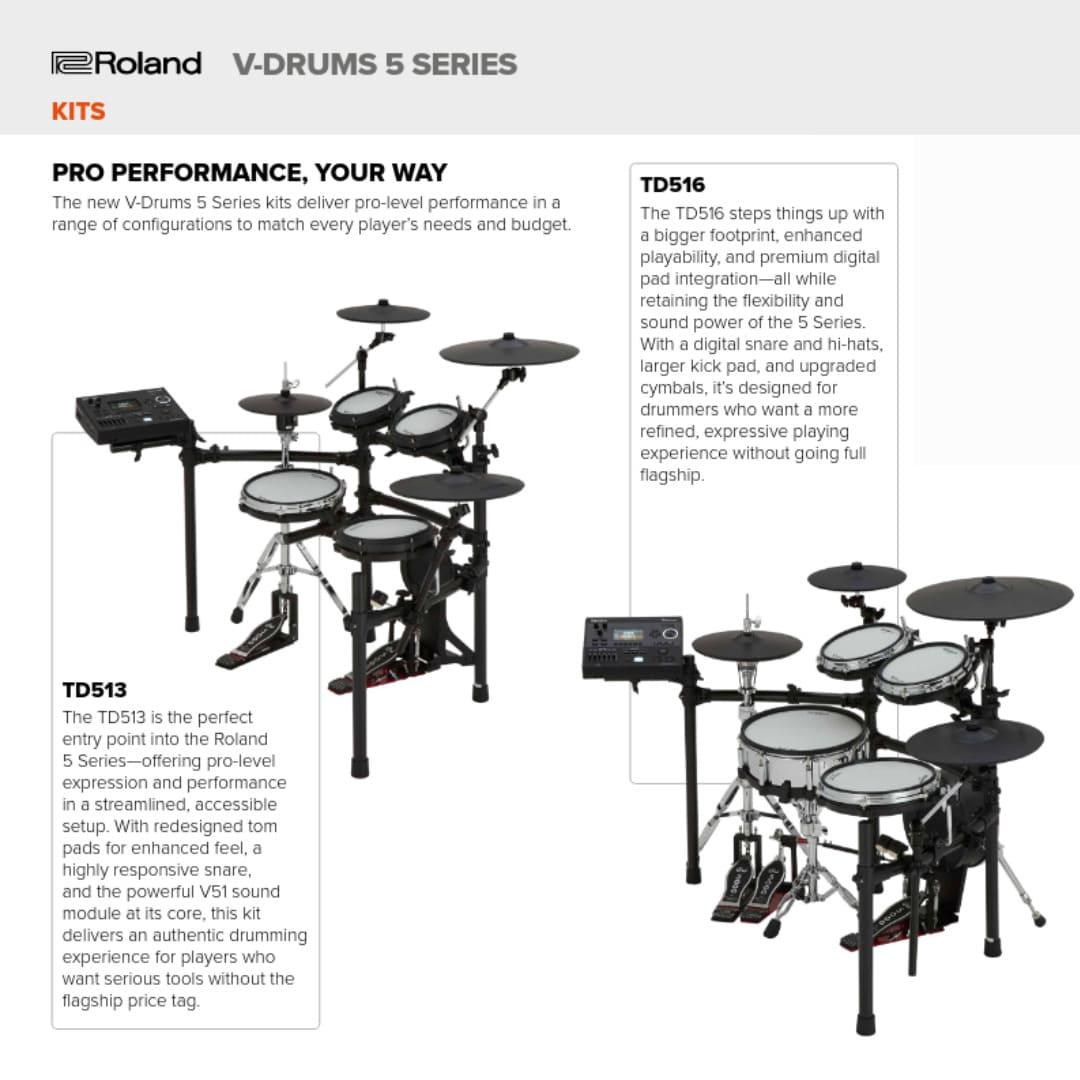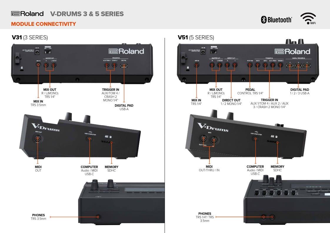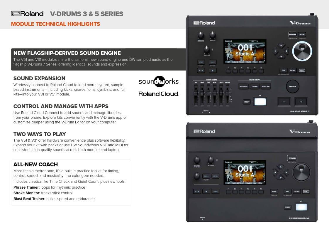 Os novos módulos V51 e V31 usam o mesmo motor e samples de DW da série de topo V-Drums 7. Permitem expandir kits via Roland Cloud e integrar com o VST DW Soundworks para máxima flexibilidade. Incluem ainda apps de gestão e um novo modo Coach com ferramentas avançadas de treino e precisão.