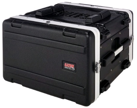 Rack 4 unidades em fibra e com trolley. Abertura frontal e traseira. Construída em plástico/fibra resistente. Calhas rack à frente e atrás permitindo montar aparelhos dos dois lados. Pega extensível para usar como trolley. Fechos de borboleta pequenos. Estrutura metálica para suportar equipamento mais pesado. Profundidade de montagem 42.5cm. Medidas 598 x 565 x 318 mm, 4 unidades rack, peso 7.7 Kg.