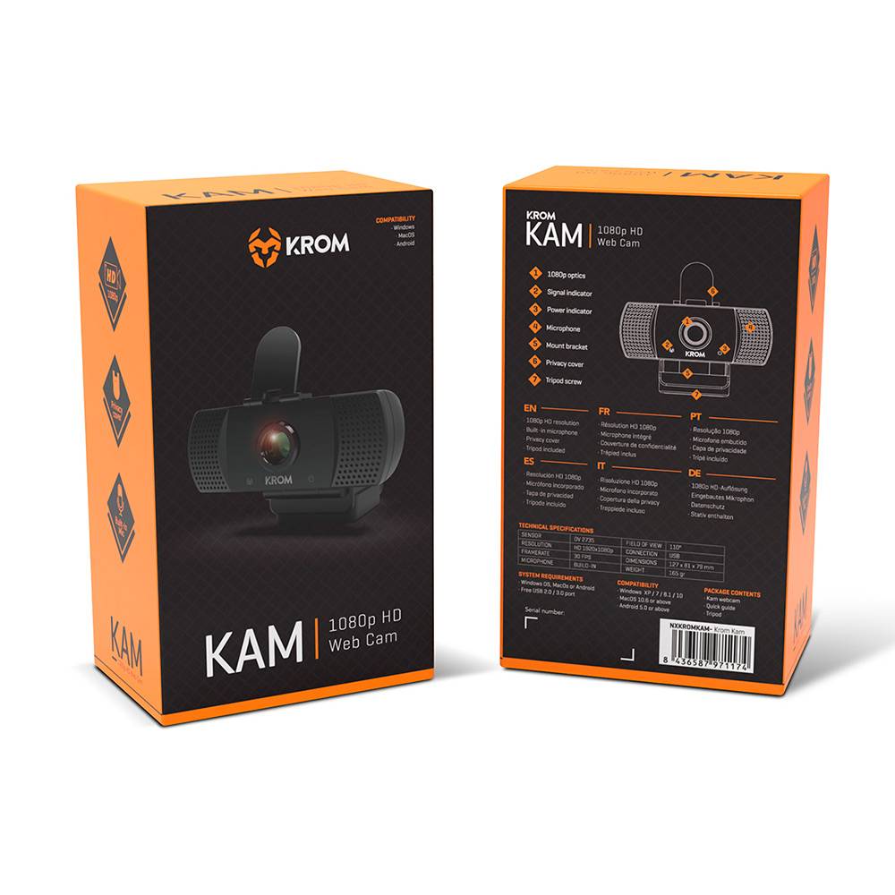 Webcam USB. A Krom Kam é uma webcam FHD compacta de 1080 pixels com um microfone integrado perfeita para sessões de streaming, bem como videoconferência no trabalho. DEFINIÇÃO FULL HD: A webcam Krom Kam é a solução perfeita para aqueles streamers que desejam aprimorar as suas sessões. Oferece uma resolução Full HD de 1920 x 1080 megapixels , o que também a torna no melhor aliado para video chamadas em trabalho ou escola, dando uma aparência mais profissional graças a uma imagem bem definida com cores naturais e luminosas. MICROFONE INTEGRADO: A Krom Kam oferece boa qualidade de vídeo, mas também de áudio, graças ao seu microfone embutido. Imagens nítidas e som nítido nas principais plataformas de video chamada, ouvindo sua voz naturalmente, como se estivesse lá. GRANDE VERSATILIDADE: A Krom Kam inclui um tripé de metal resistente, ajustável em altura, o que torna fácil manter a webcam sempre na posição correta para diferentes gravações ou transmissões ao vivo. Além disso, Krom Kam encaixa-se confortavelmente no ecrã do seu computador ou portátil, graças à sua base de suporte. Além disso, a sua estrutura permite que seja facilmente posicionada e girada horizontal e verticalmente. PRIVACIDADE ASSEGURADA: A Krom Kam incorpora uma tampa deslizante, para proteger a privacidade quando não está em uso. ELEVADA COMPATIBILIDADE: É uma webcam intuitiva e fácil de usar, cuja instalação não requer nada de especial. Basta conectar ao computador via USB, seja um PC ou portátil, e será instalada automaticamente. Krom Kam é compatível com os sistemas operativos mais comuns: Windows, Android, Mac e Linux. Especificações: Sensor: OV 2735. Resolução: Full HD, 1920 x 1080. Velocidade: 30 FPS. Microfone: Integrado. Campo de visão: 110º. Conexão: USB. Dimensões: 127 x 81 x 79 mm. Peso: 165 gr.