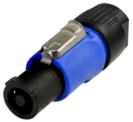 Ficha Powercon / Power Twist de cabo. Conector de entrada de alimentação (power-in), codificado com cor preto/azul, tipo A. 20A por pólo. Sistema de travão para bloqueio de desengate. Solução para conexão segura. Aperto por parafuso. Bucha de travamento. Compatível com cabos de condutores até 2,5mm2.